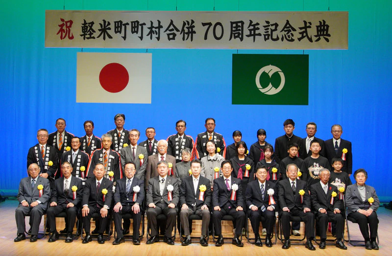 軽米町町村合併70周年記念式典が11月21日に宇漢米館で開催されました。昭和30年に旧軽米町・小軽米村・晴山村が合併してから70年の節目を迎え、来賓や町民の皆さんが出席し、歴史を振り返りました。式典では町長がこれまで町を支えてきた先人と町民への感謝を述べるとともに、次の時代へ向けたまちづくりへの決意を語りました。