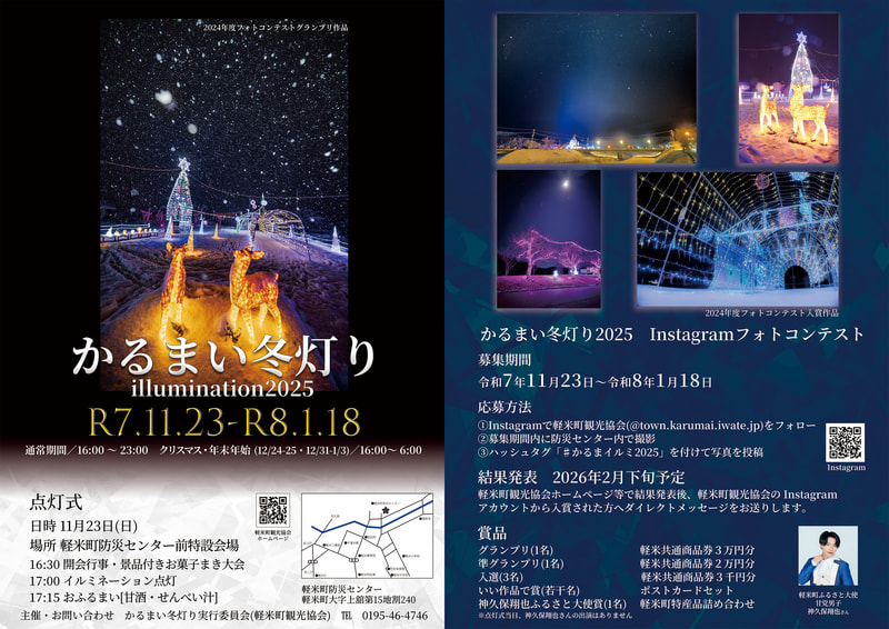 かるまい冬灯り2025がはじまります 公開日:令和7年 11月13日/最終更新日:令和7年 11月13日 Facebookシェア Twitter 今年もかるまい冬灯りが開催されます。 11月23日には防災センター前特設会場にてイルミネーション点灯式が開催され、 インスタグラムフォトコンテストの作品募集も行われます。